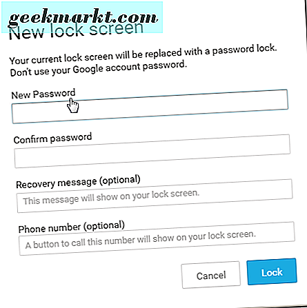 Hvis du skulle velge Lås- alternativet, vil du bli bedt om å angi et nytt låseskjermspassord for å forhindre uautorisert tilgang. Du vil også kunne sette inn en gjenopprettelsesmelding og telefonnummer som vil være synlig på låseskjermbildet. Å gjøre dette kan hjelpe deg med å få enheten til å bli gjenopprettet.
