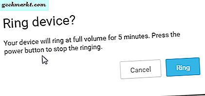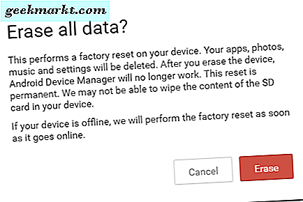 Hvis du skulle velge Erase- alternativet, ble enheten slettet helt. Vær oppmerksom på at hvis du slettet enheten din, vil Android Enhetsbehandling ikke lenger fungere. Det er en permanent tilbakestilling. Innholdet på ditt SD-kort kan ikke slettes når du velger dette alternativet. Også, hvis enheten din er frakoblet, vil tilbakestillingen bli utført så snart den går online igjen. Dette er et siste grøftalternativ som angitt før, siden du ikke lenger kunne spore enheten med Android Enhetsbehandling hvis dette alternativet brukes.