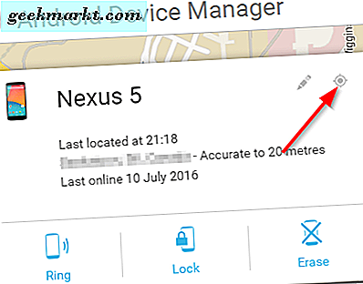 Android Enhetsbehandling lar deg finne enheten din som nevnt tidligere. For å gjøre dette, trykker du på ikonet for plasseringsikonet i skjermbildet nedenfor.