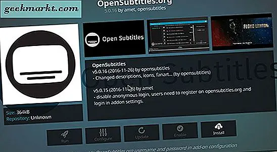 Undertekstkategorien laster en lang liste over alternativer og valg du kan velge å laste ned fra, de fleste av dem vises som nettadresser i deres titler. Du kan laste ned hvilken tjeneste du vil, men vi anbefaler at du bruker OpenSubtitles.org. Som en åpen plattform for de fleste undertekster, gjør OpenSubtitles.org det enkelt å legge til subs i alle videoer, både lokale og streaming. De sporer undertekster for både fjernsyn og filmer, slik at du kan ta tak i undertekstene, uansett hvilken type medie du ser, noe som gjør det til et enkelt tillegg til enhver liste. Klikk på alternativet for å legge til OpenSubtitles til Kodi-plattformen, og klikk deretter på installasjon på menyalternativet.
