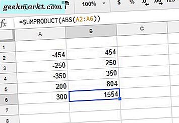Før du legger til SUMPRODUCT-formelen i regnearket, skriv inn '200' i celle A5 og '300' i A6. Skriv deretter inn formelen '= SUMPRODUCT (ABS (A2: A6))' i celle B6, og trykk på Retur. B6 legger nå celleområdet A2: A6 og returnerer en absolutt verdi på 1.554.
