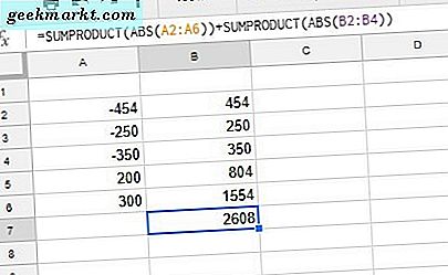 Du kan også utvide formelen slik at den legger til to eller flere cellelinjer. Velg celle B7 i regnearket ditt, og skriv inn '= SUMPRODUCT (ABS (A2: A6)) + SUMPRODUCT (ABS (B2: B4))' i funksjonslinjen. Formelen vil legge til tallene i områdene A2: A6 og B2: B4 med absoluttverdien på totalt 2, 608.
