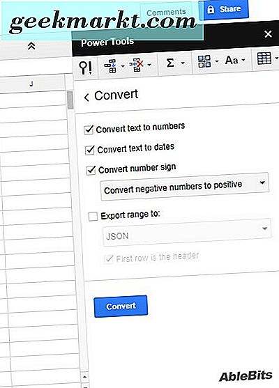 Når du har installert tillegget, åpner du regnearket for arkene og klikker på Add-ons > Verktøy . Velg Konverter fra undermenyen for å åpne Verktøy som i bildet nedenfor. Det åpner konverteringsalternativene til tillegget.