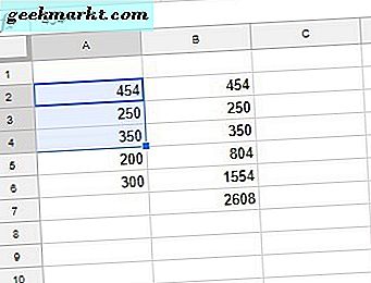 Kopier funksjonen til de andre cellene med fyllhåndtaket. Velg B2, venstre-klikk på celleens nederste høyre hjørne og dra markøren over B3 og B4. Slip deretter venstre museknapp for å kopiere ABS-funksjonen til de cellene som vist på skjermbildet nedenfor. Denne Tech Junkie-guiden gir ytterligere detaljer for bruk av fyllingshåndtaket i Google Sheets.